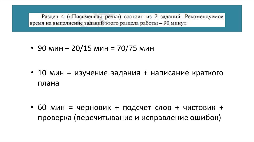 • 90 мин – 20/15 мин = 70/75 мин• 10 мин = изучение задания + написание краткого