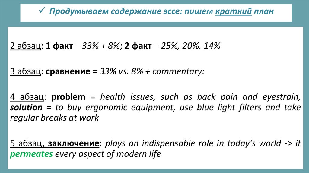 Продумываем содержание эссе: пишем краткий план2 абзац: 1 факт – 33% + 8%; 2 факт – 25%, 20%, 14%