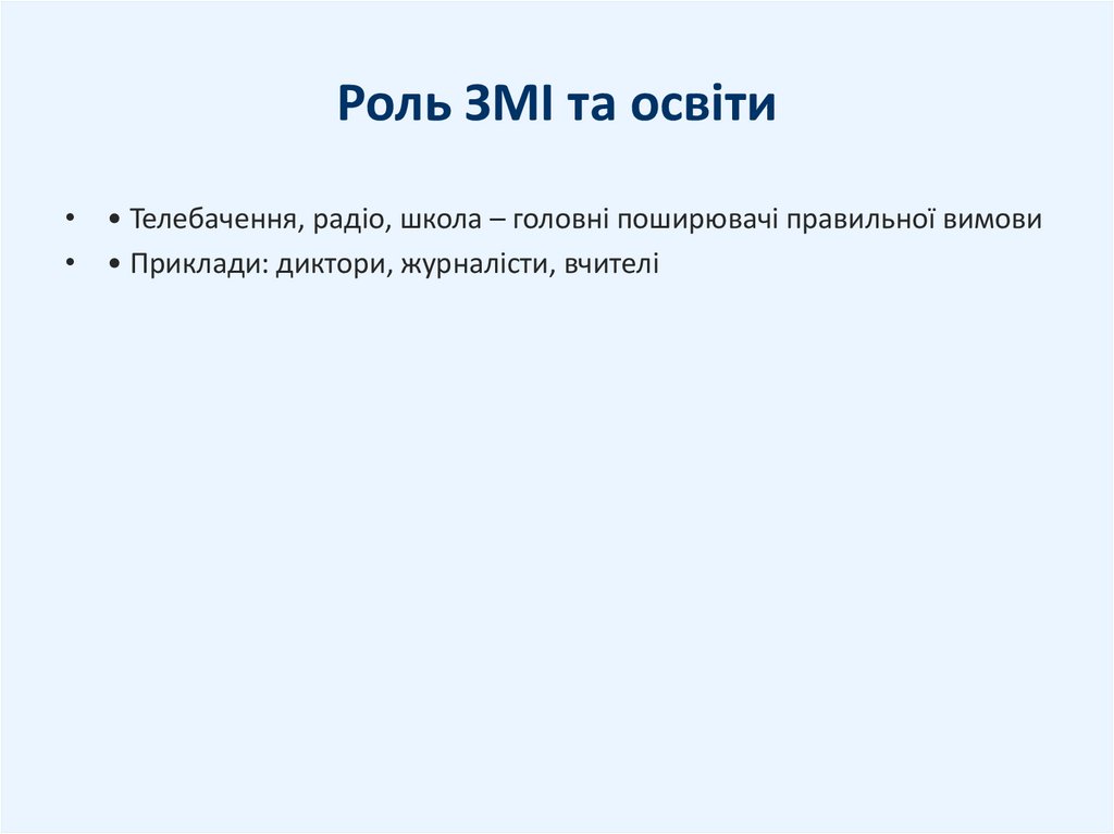Роль ЗМІ та освіти• • Телебачення, радіо, школа – головні поширювачі правильної вимови