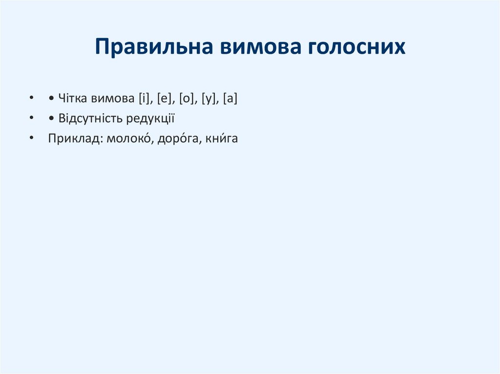 Правильна вимова голосних• • Чітка вимова [і], [е], [о], [у], [а]