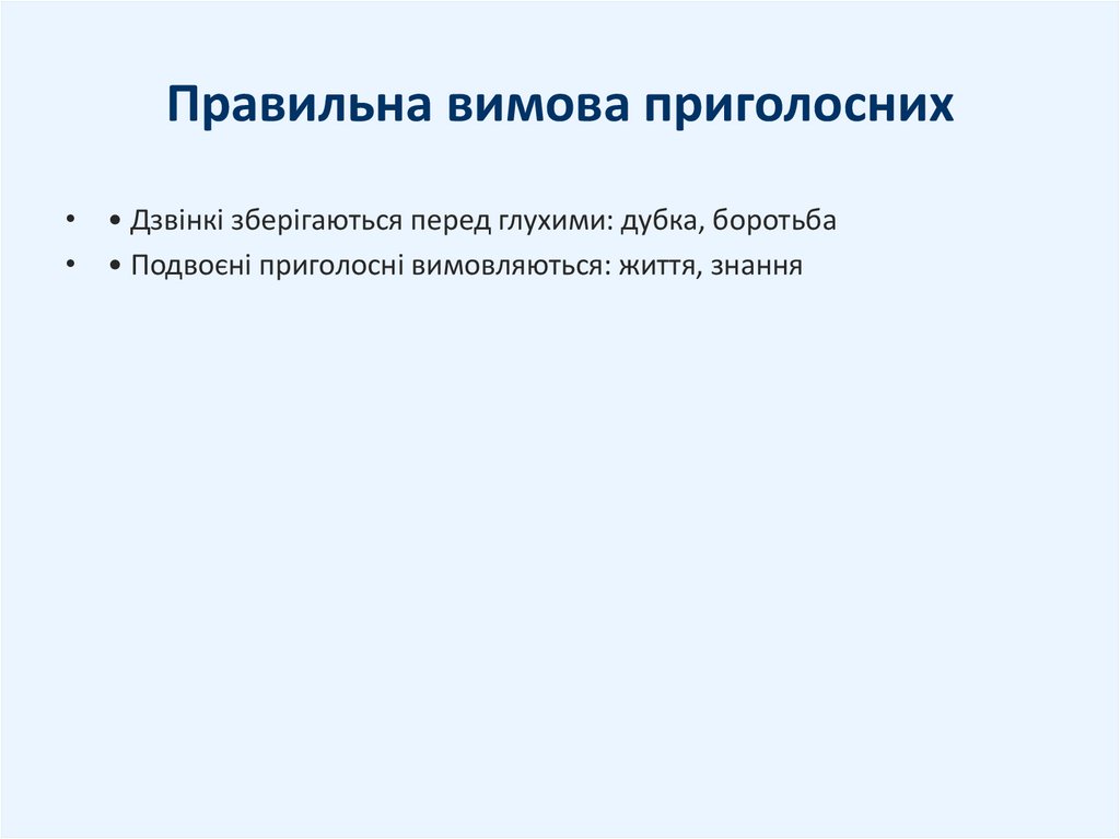 Правильна вимова приголосних• • Дзвінкі зберігаються перед глухими: дубка, боротьба