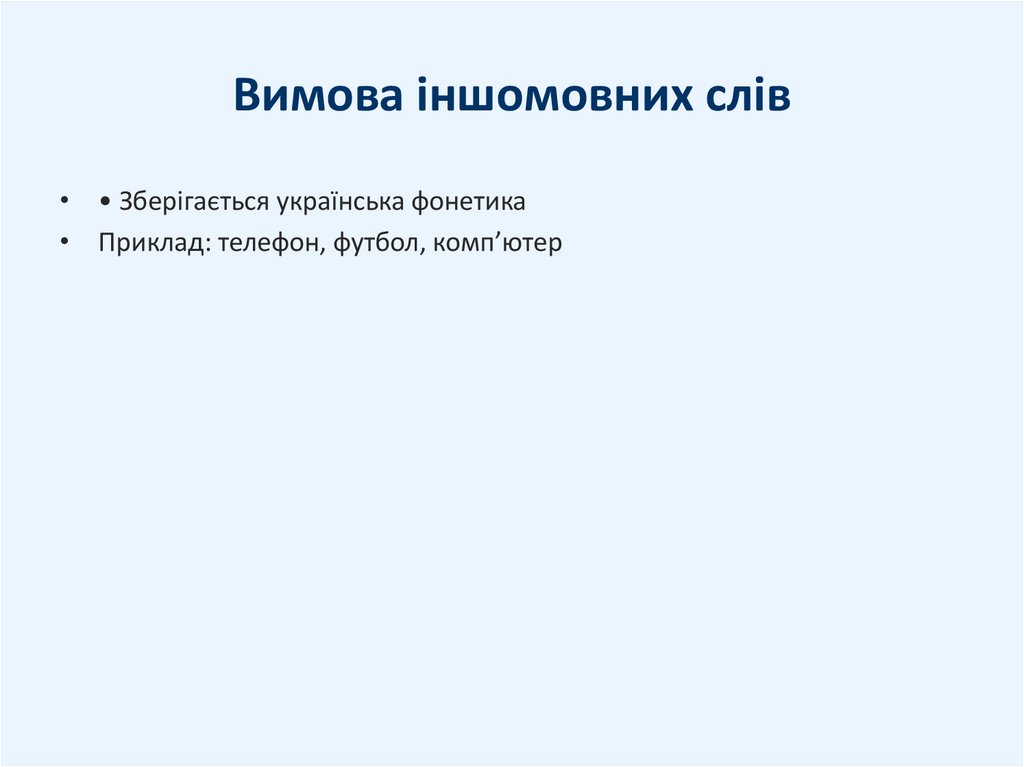 Вимова іншомовних слів• • Зберігається українська фонетика