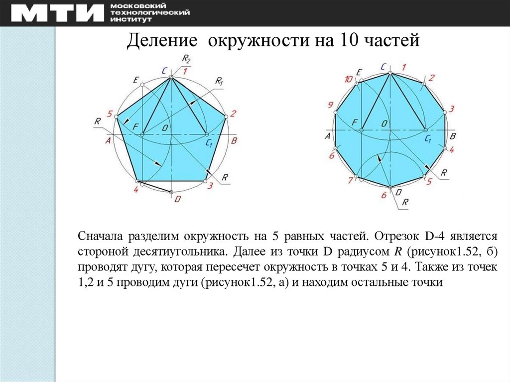 стороной десятиугольника. Далее из точки D радиусом R (рисунок1.52, б)