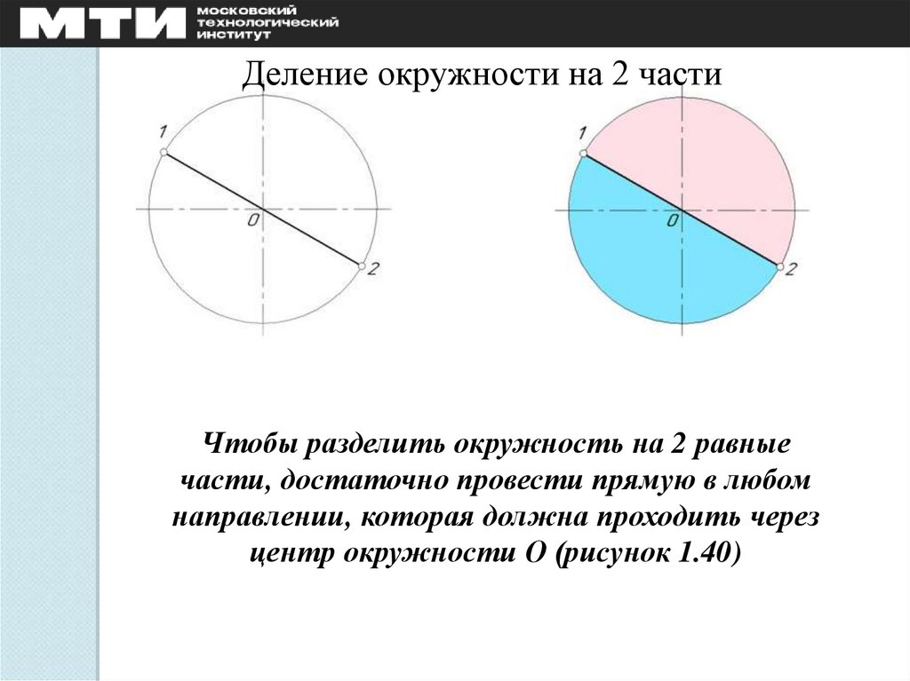 Деление окружности на 2 частиЧтобы разделить окружность на 2 равные