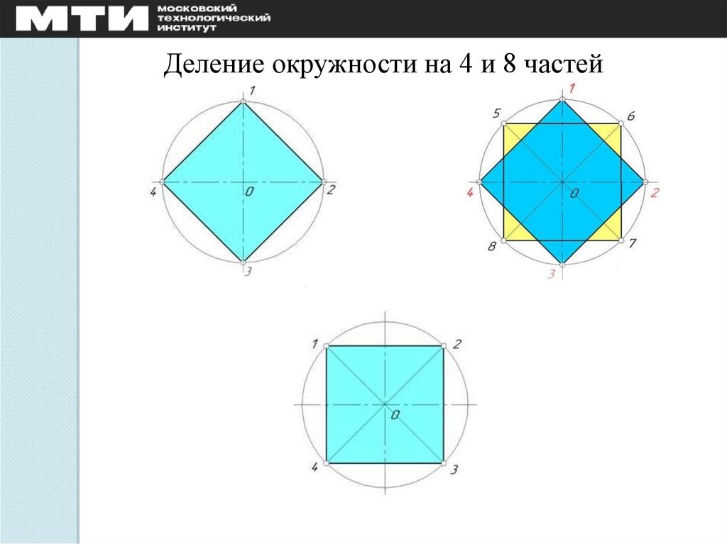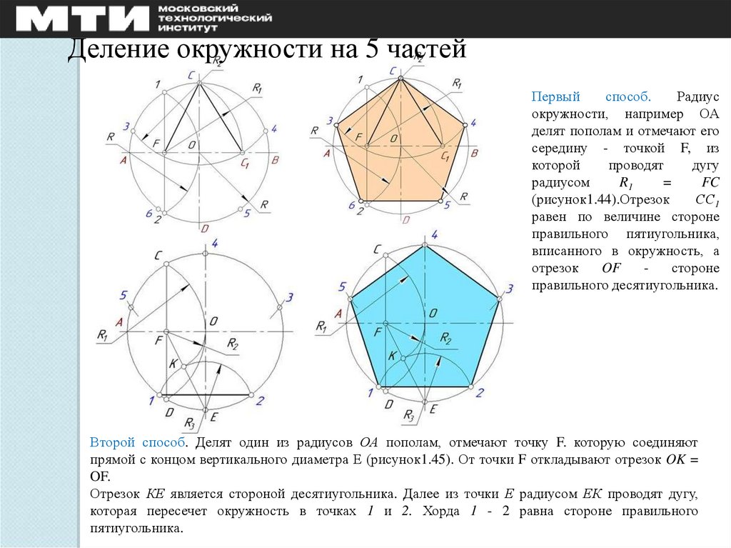 Деление окружности на 10 частейСначала разделим окружность на 5 равных частей. Отрезок D-4 является