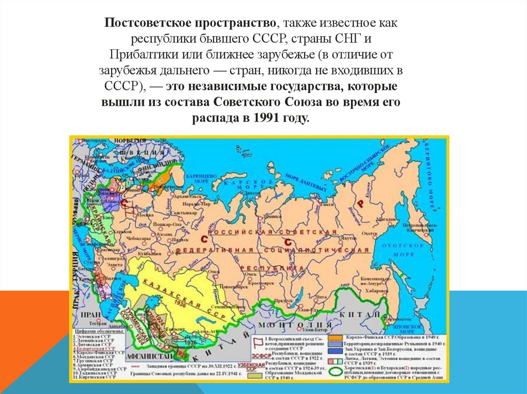 Постсоветское пространство, также известное какреспублики бывшего СССР, страны СНГ и