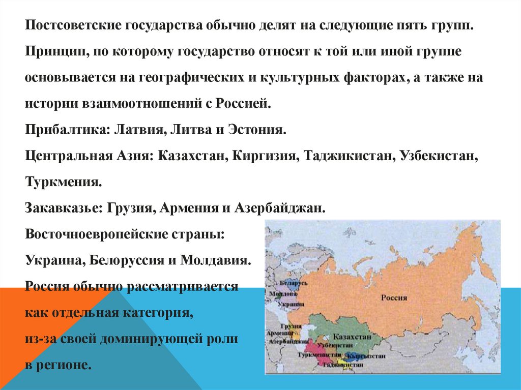 Постсоветские государства обычно делят на следующие пять групп.Принцип, по которому государство относят к той или иной группе