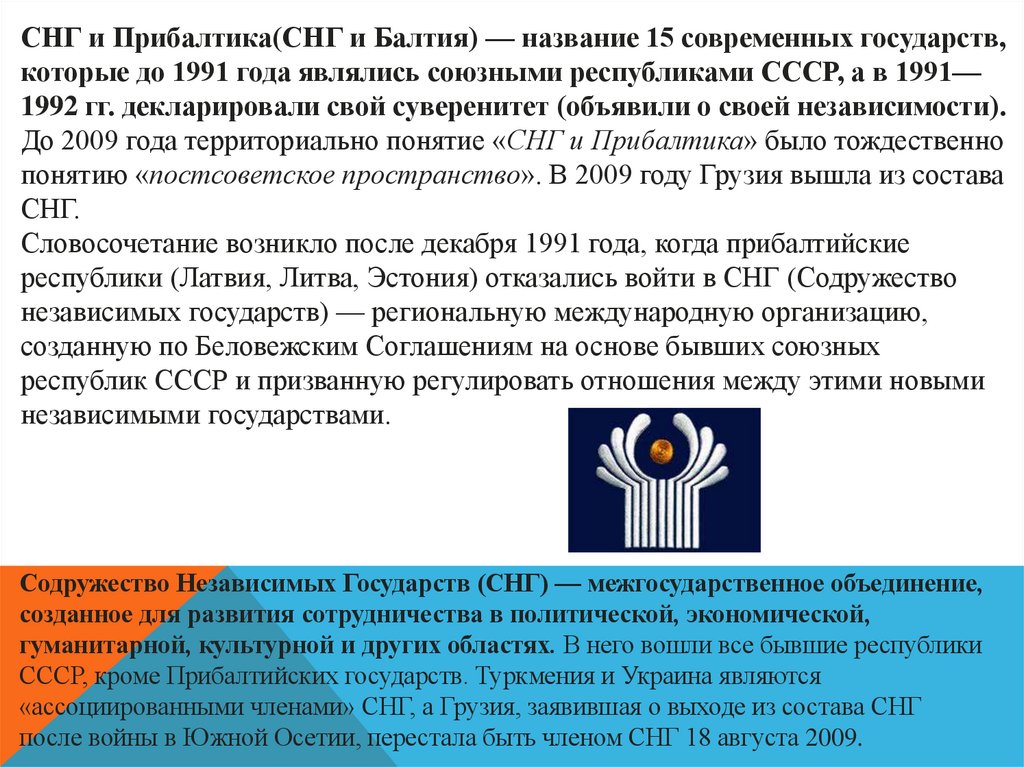 СНГ и Прибалтика(СНГ и Балтия) — название 15 современных государств,которые до 1991 года являлись союзными республиками СССР, а в 1991—