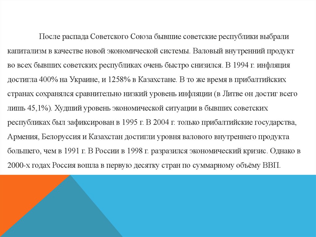 После распада Советского Союза бывшие советские республики выбраликапитализм в качестве новой экономической системы. Валовый внутренний продукт