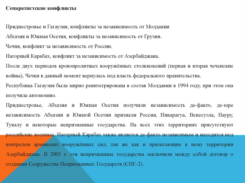 Сепаратистские конфликтыПриднестровье и Гагаузия, конфликты за независимость от Молдавии