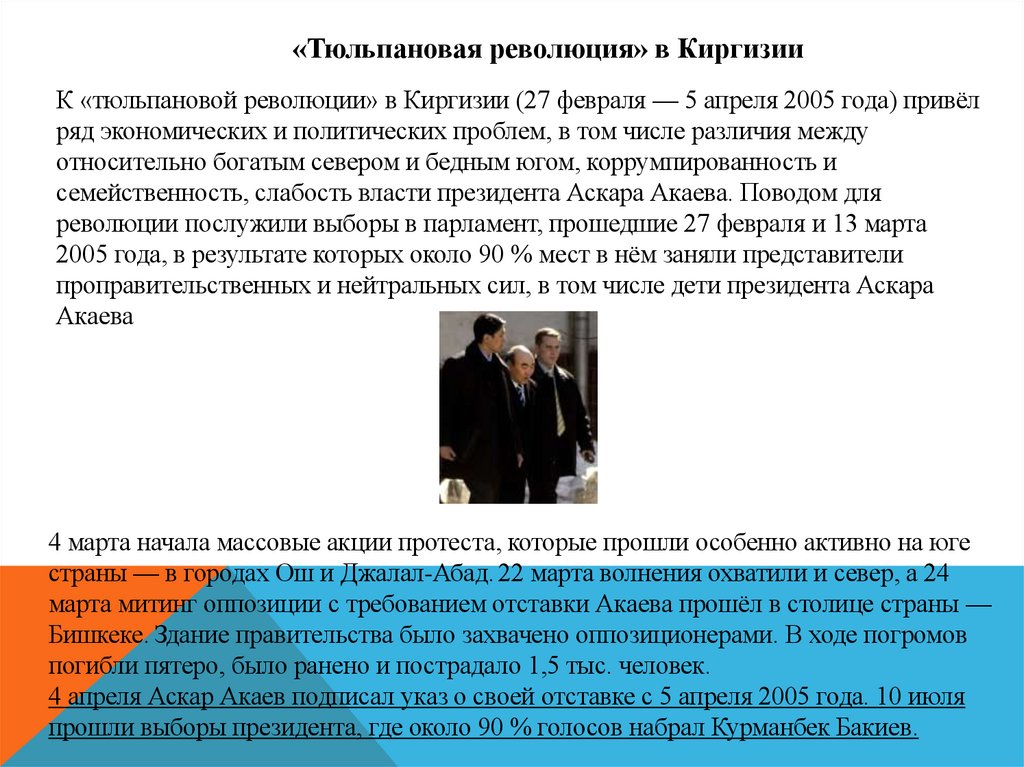 «Тюльпановая революция» в КиргизииК «тюльпановой революции» в Киргизии (27 февраля — 5 апреля 2005 года) привёл