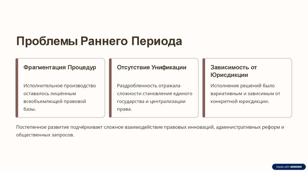 Постепенное развитие подчёркивает сложное взаимодействие правовых инноваций, административных реформ и
