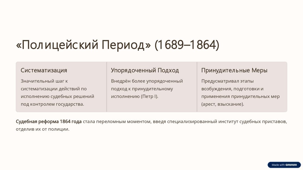 Судебная реформа 1864 года стала переломным моментом, введя специализированный институт судебных приставов,