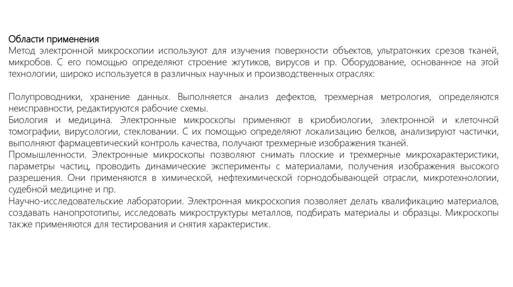 Области примененияМетод электронной микроскопии используют для изучения поверхности объектов, ультратонких срезов тканей,