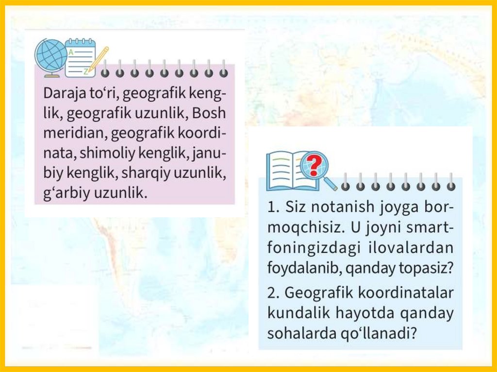 3. Yer yuzidagi biror joyni, uning o‘rnini xarita yoki globusdan qanday topish mumkin?