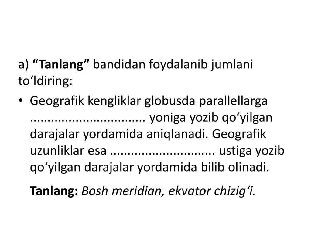 a) “Tanlang” bandidan foydalanib jumlanito‘ldiring: