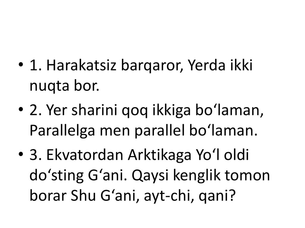 13. Lekin har bir parallelda bitta nuqta emas, juda ko‘p nuqtalar bor. Shuning uchun globus va xaritalardagi kerakli nuqtaning