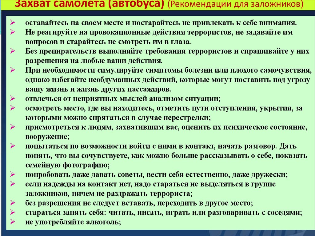 Захват самолета (автобуса) (Рекомендации для заложников)оставайтесь на своем месте и постарайтесь не привлекать к себе внимания.