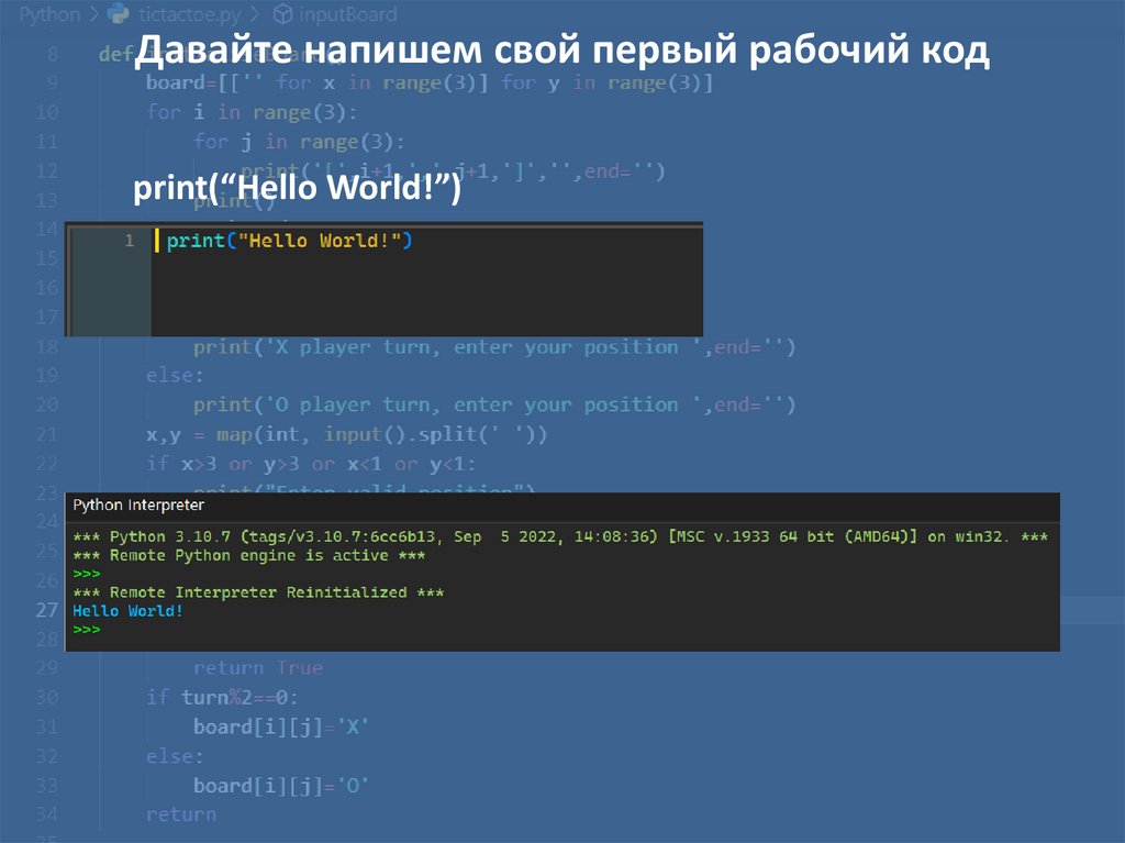 Давайте напишем свой первый рабочий кодprint(“Hello World!”)