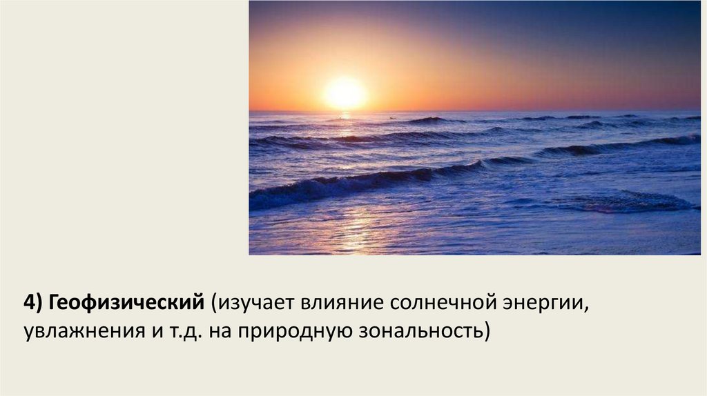 4) Геофизический (изучает влияние солнечной энергии,увлажнения и т.д. на природную зональность)