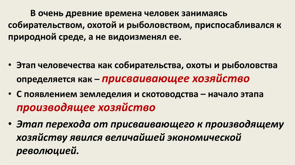 В очень древние времена человек занимаясьсобирательством, охотой и рыболовством, приспосабливался к