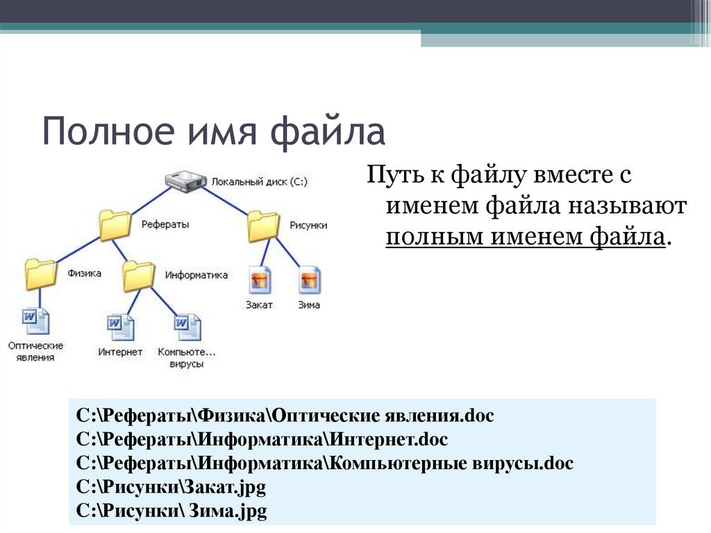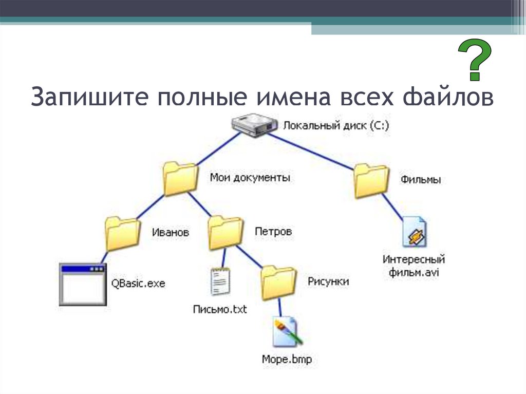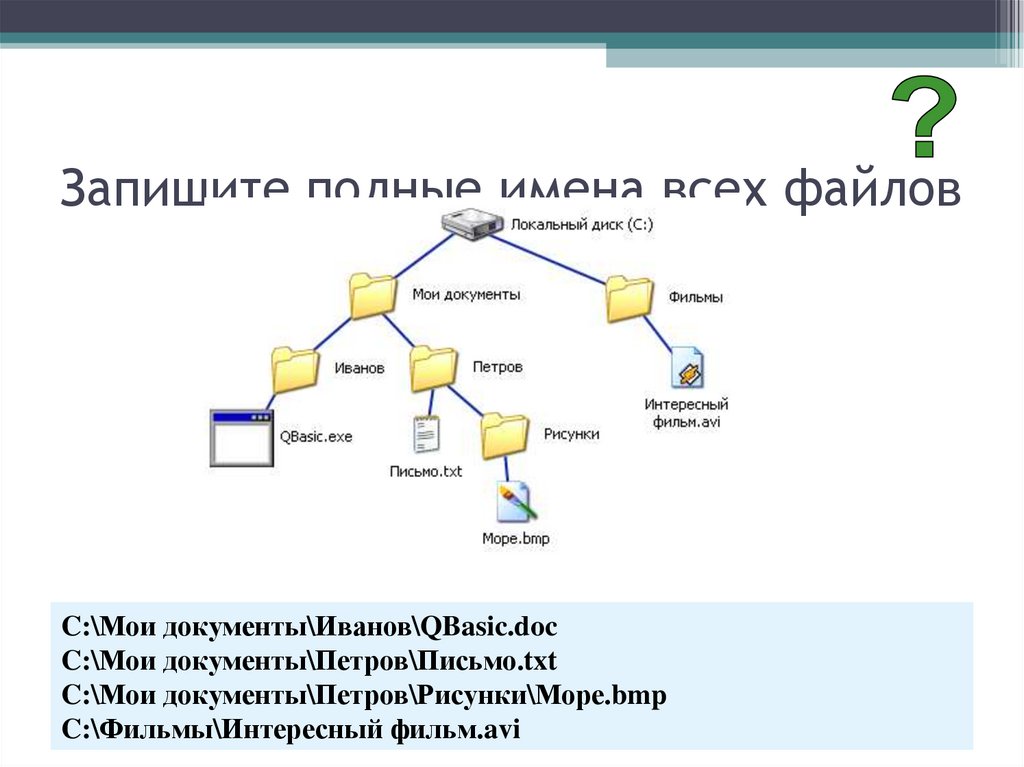 Запишите полные имена всех файловC:\Мои документы\Иванов\QBasic.doc