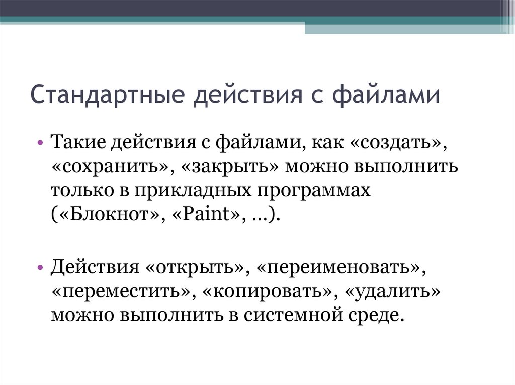 Стандартные действия с файлами• Такие действия с файлами, как «создать»,