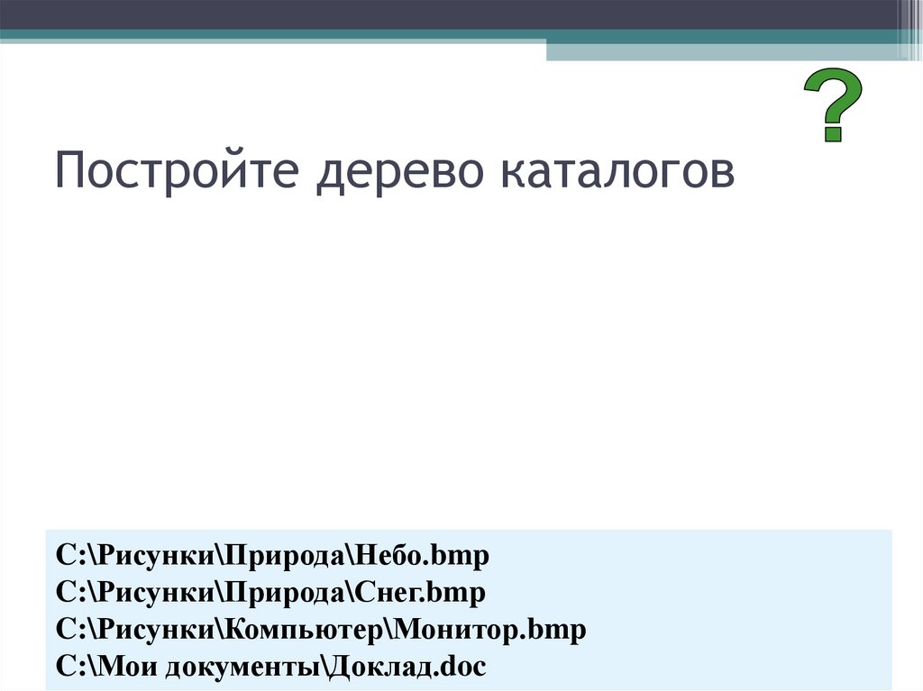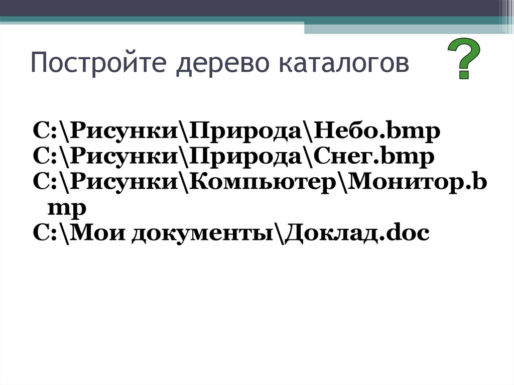 Постройте дерево каталоговC:\Рисунки\Природа\Небо.bmp