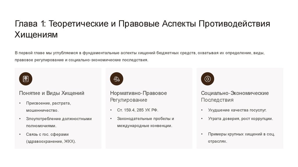 В первой главе мы углубляемся в фундаментальные аспекты хищений бюджетных средств, охватывая их определение, виды,