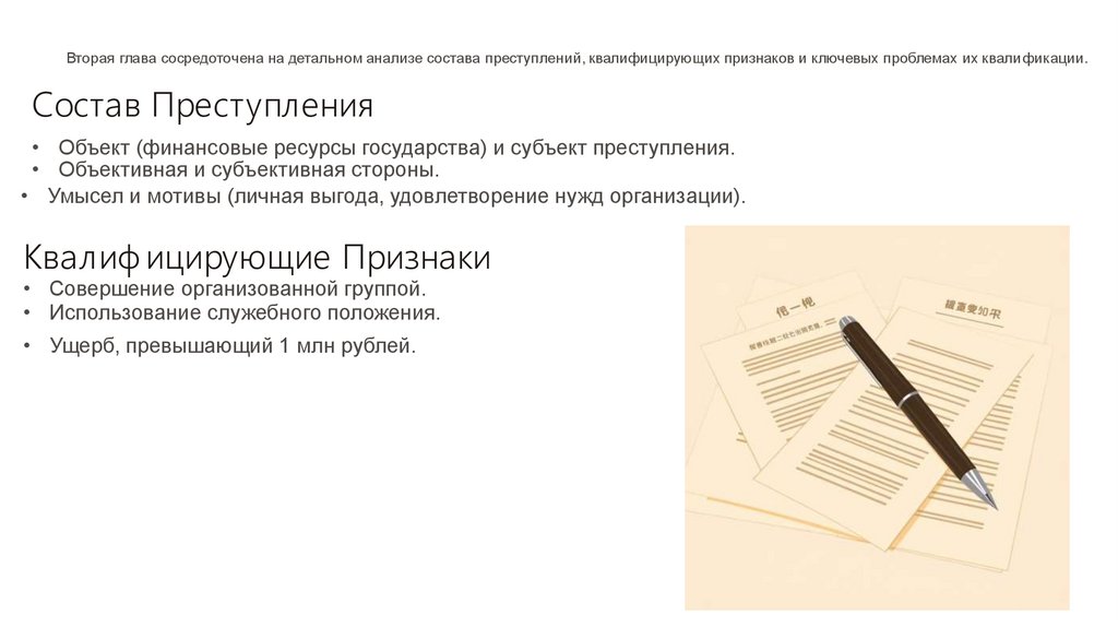 Вторая глава сосредоточена на детальном анализе состава преступлений, квалифицирующих признаков и ключевых проблемах их квалификации.Состав Преступления