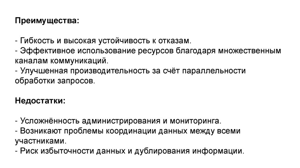 Преимущества:- Гибкость и высокая устойчивость к отказам.