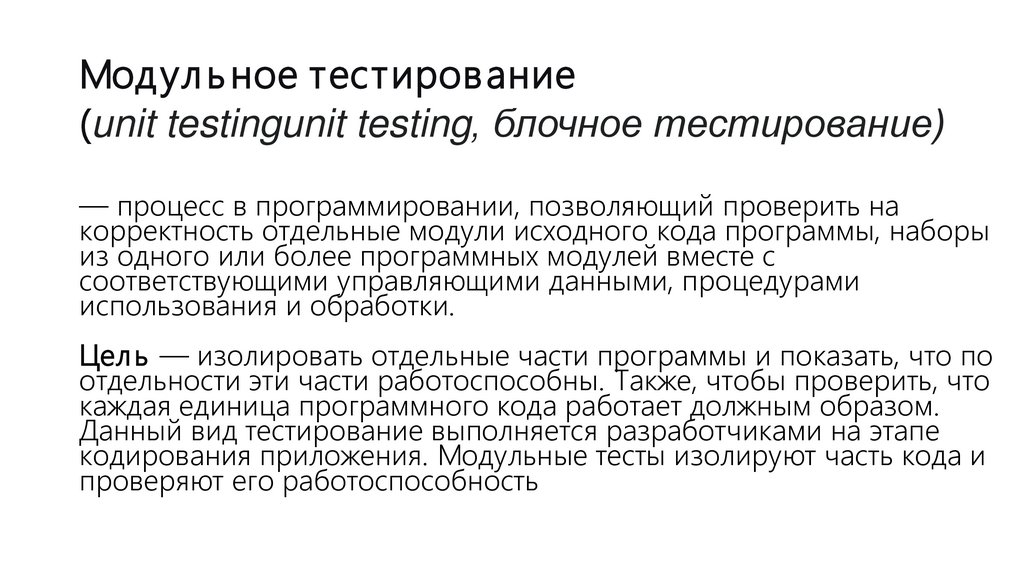 Модул ь ное тестирование(unit testingunit testing, блочное тестирование)