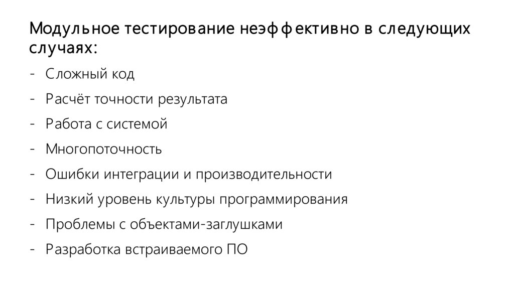 Модул ь ное тестиров ание неэф ф ектив но в сл едующихсл учаях :