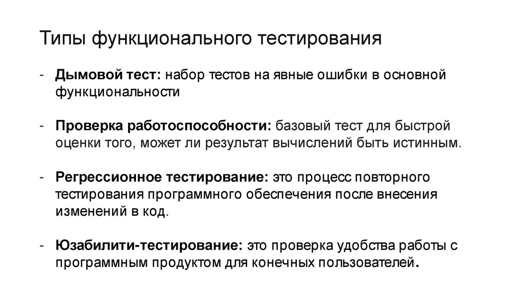 Типы функционального тестирования- Дымовой тест: набор тестов на явные ошибки в основной