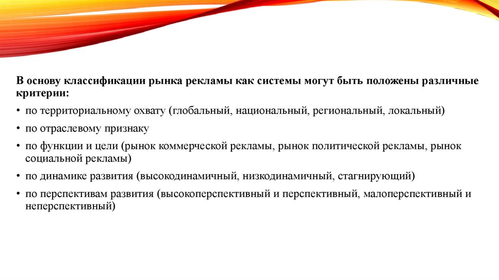 В основу классификации рынка рекламы как системы могут быть положены различныекритерии: