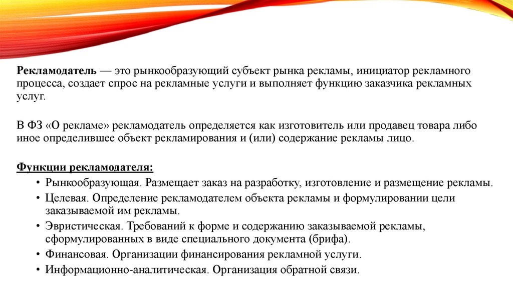 Рекламодатель — это рынкообразующий субъект рынка рекламы, инициатор рекламногопроцесса, создает спрос на рекламные услуги и выполняет функцию заказчика рекламных