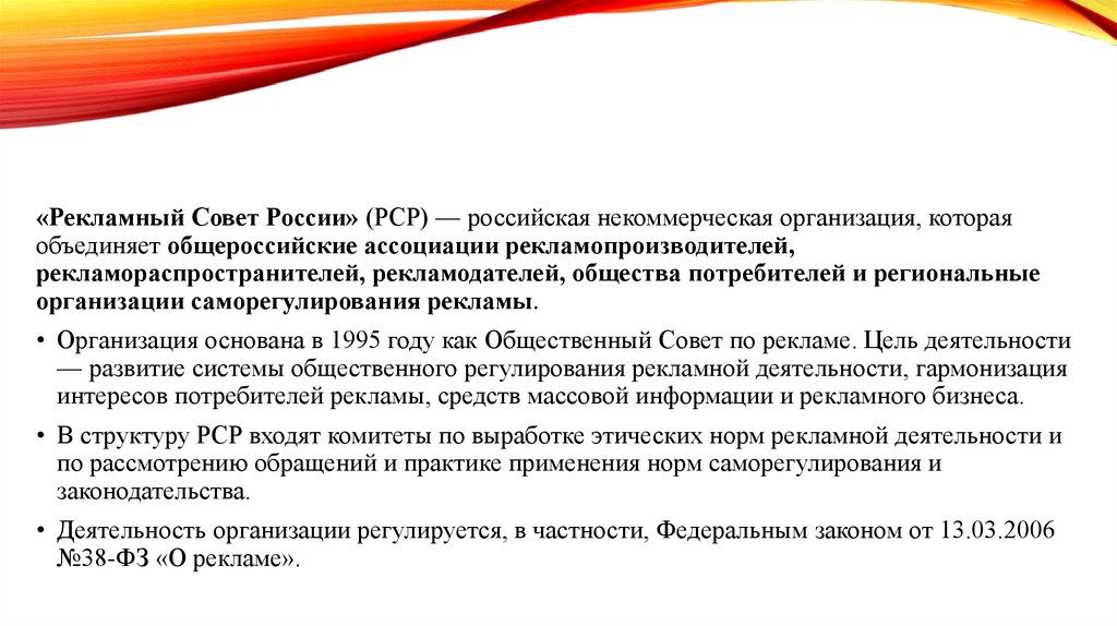 • В структуру РСР входят комитеты по выработке этических норм рекламной деятельности и