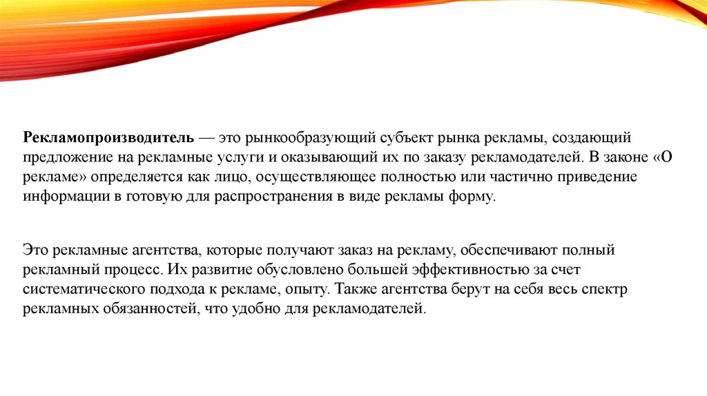 Рекламопроизводитель — это рынкообразующий субъект рынка рекламы, создающийпредложение на рекламные услуги и оказывающий их по заказу рекламодателей. В законе «О