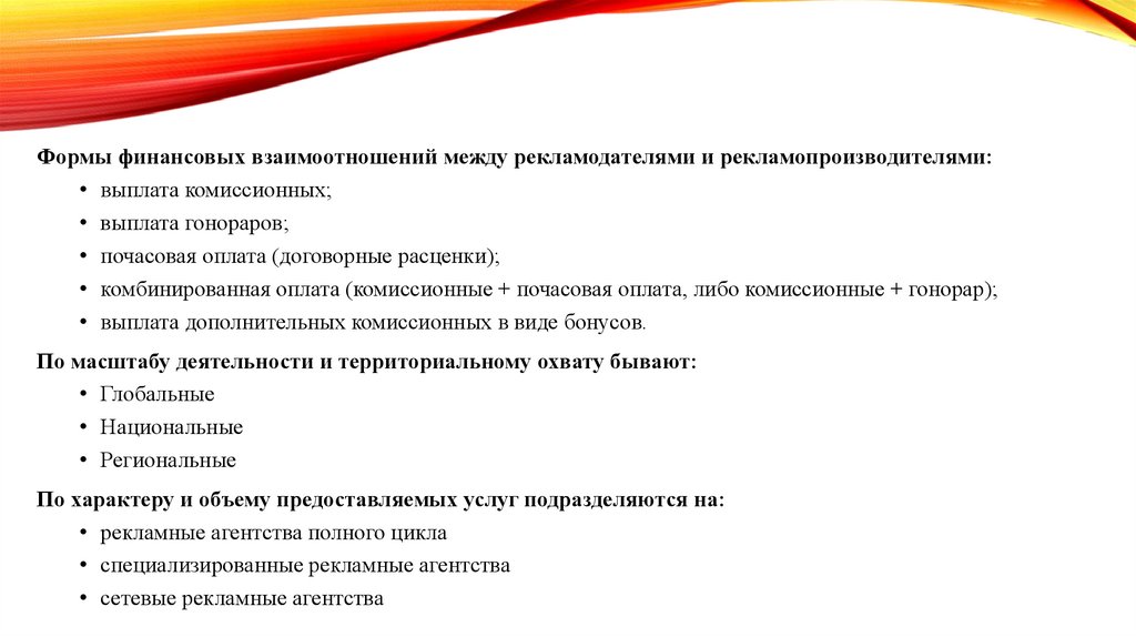 Формы финансовых взаимоотношений между рекламодателями и рекламопроизводителями:• выплата комиссионных;