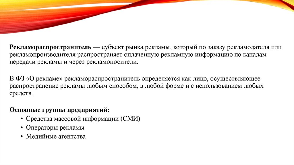 Рекламораспространитель — субъект рынка рекламы, который по заказу рекламодателя илирекламопроизводителя распространяет оплаченную рекламную информацию по каналам