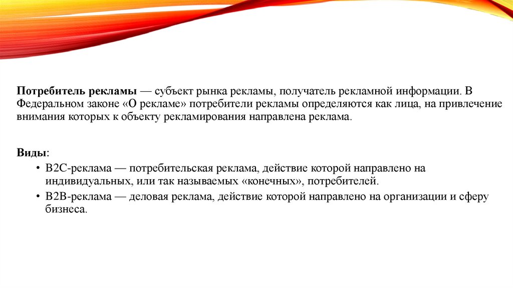 Потребитель рекламы — субъект рынка рекламы, получатель рекламной информации. ВФедеральном законе «О рекламе» потребители рекламы определяются как лица, на привлечение