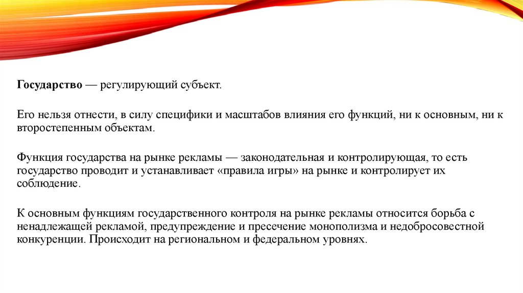 Функция государства на рынке рекламы — законодательная и контролирующая, то есть