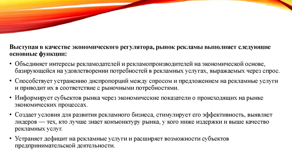 Выступая в качестве экономического регулятора, рынок рекламы выполняет следующиеосновные функции: