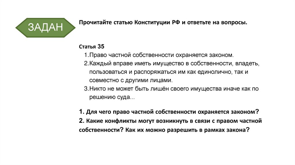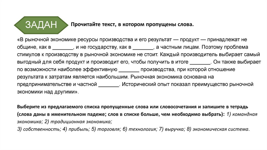 ЗАДАН Прочитайте текст, в котором пропущены слова.ИЕ экономике ресурсы производства и его результат — продукт — принадлежат не