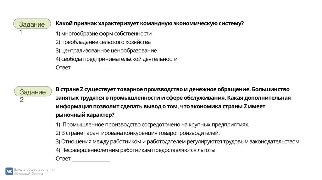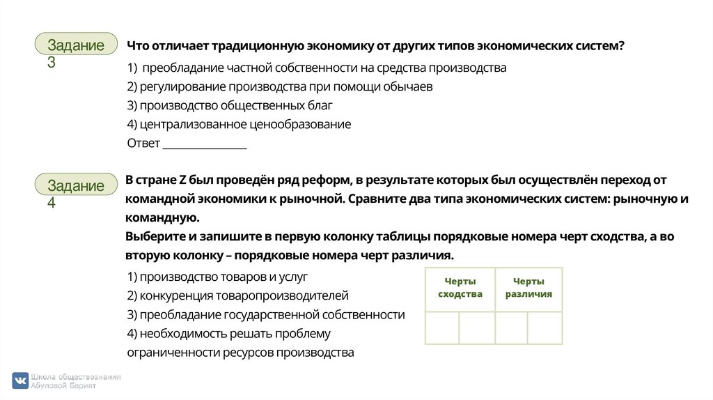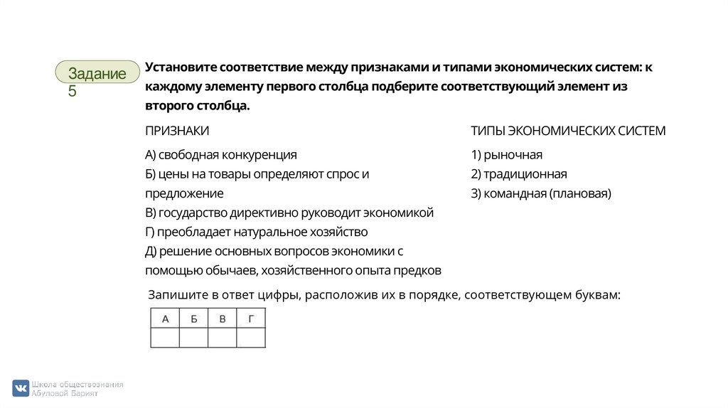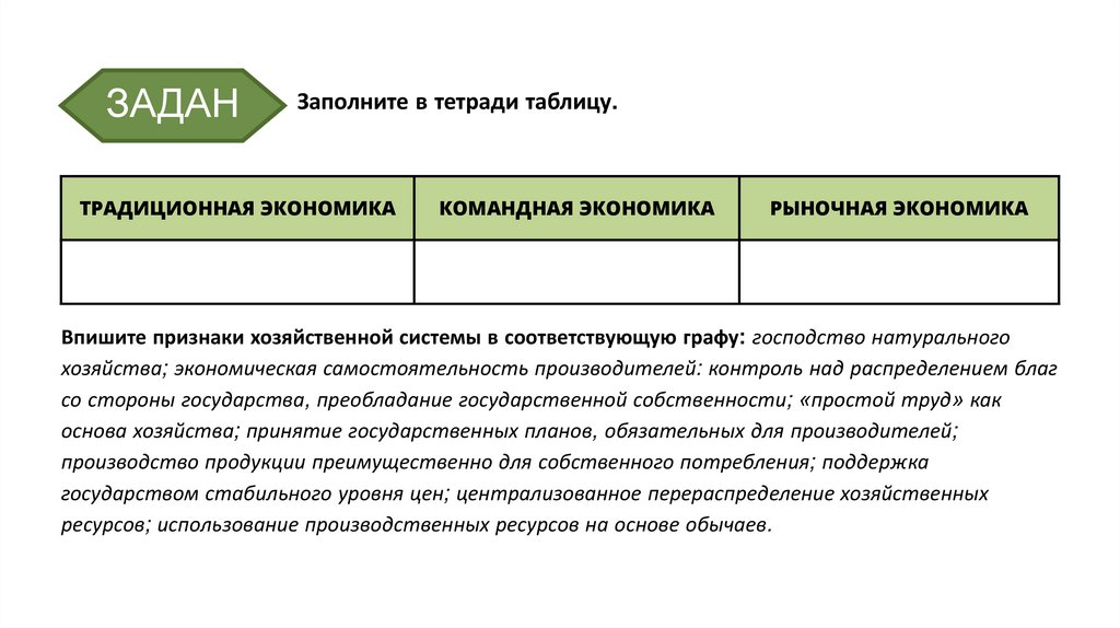 Впишите признаки хозяйственной системы в соответствующую графу: господство натурального