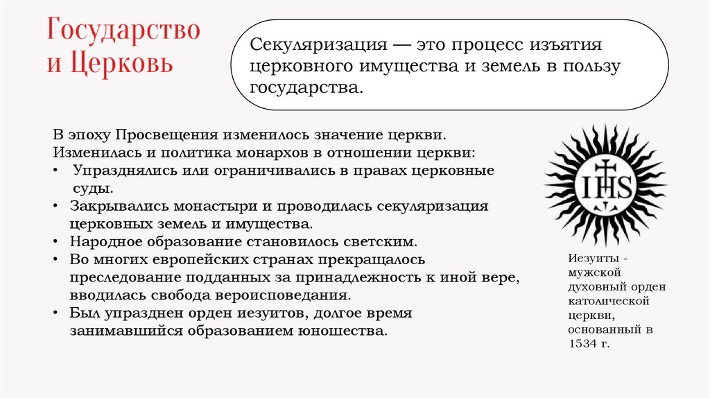 Секуляризация — это процесс изъятияцерковного имущества и земель в пользу