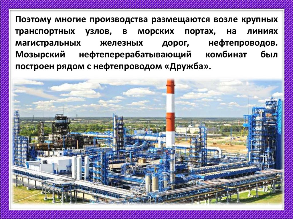 Поэтому многие производства размещаются возле крупныхтранспортных узлов, в морских портах, на линиях