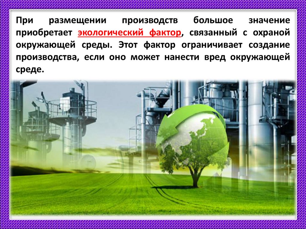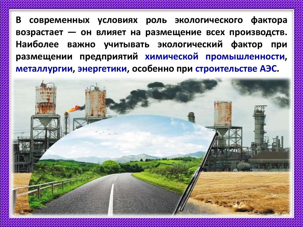 В современных условиях роль экологического факторавозрастает — он влияет на размещение всех производств.