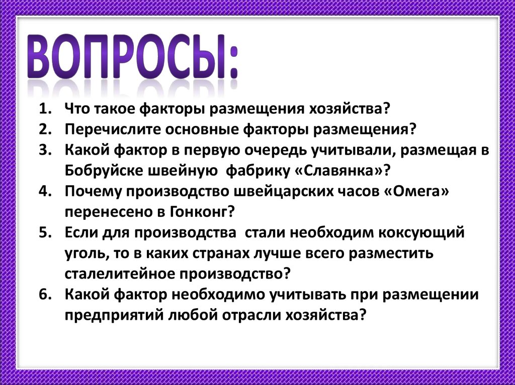 1. Что такое факторы размещения хозяйства?2. Перечислите основные факторы размещения?