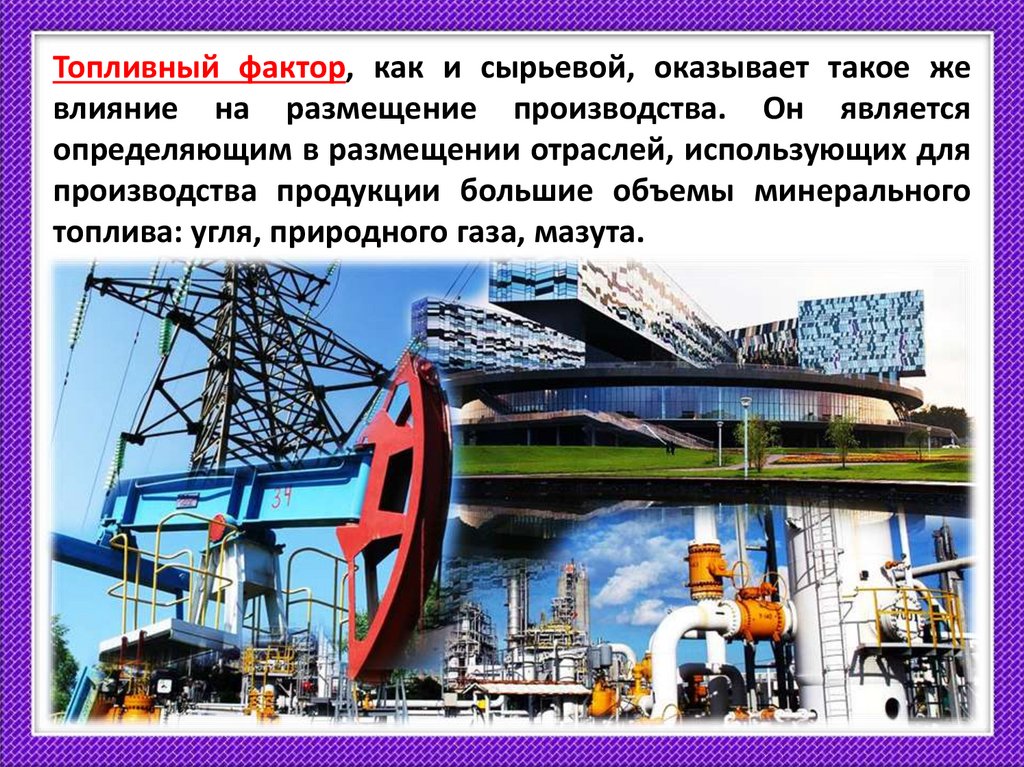 Топливный фактор, как и сырьевой, оказывает такое жевлияние на размещение производства. Он является